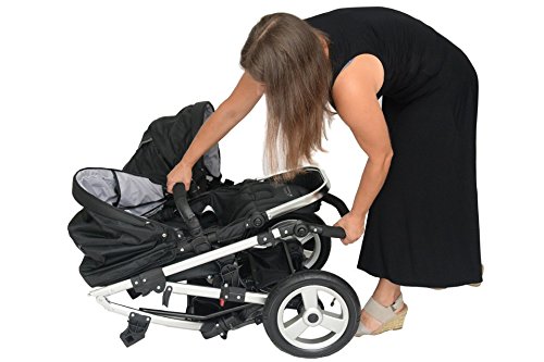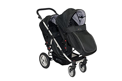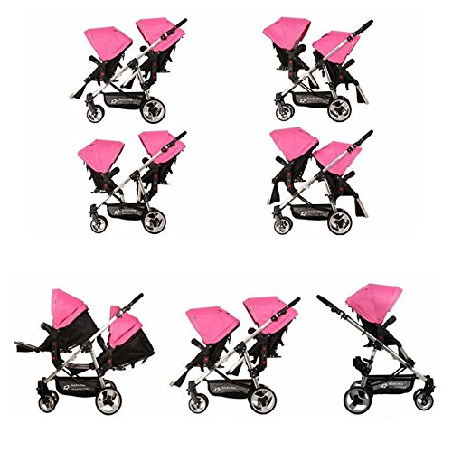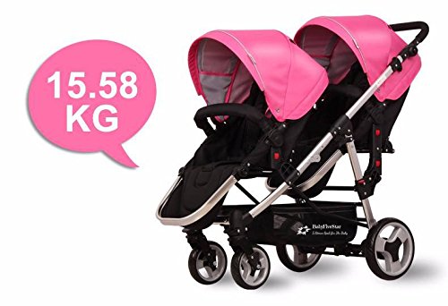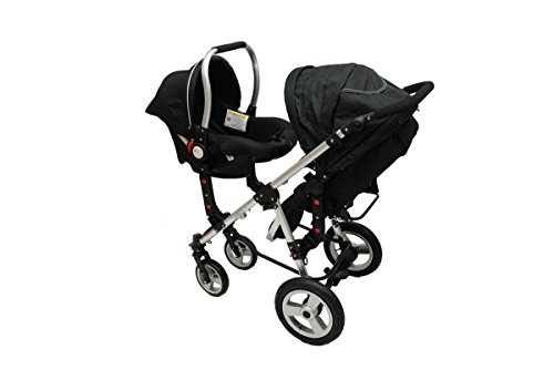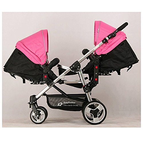Der Zwillings- und Geschwisterwagen von BabyFiveStar bietet Fahrspaß für zwei. Die mitgelieferten Sportwagenaufsätze zeigen sich äußerst flexibel und anpassungsfähig, durch den Neigungswinkel der Rückenlehne sitzen die Kinder in optimaler, Rückenschonender Position. Die Aufsätze lassen sich beliebig wenden, sodass sie mit Blickrichtung in und gegen Fahrtrichtung montiert werden können. Die Lehne können in eine fast waagerechte Position verstellt werden! Technische Daten / Beschreibung: Zusammengelegt LXBXH: 88 x 58 x 50 CM Aufgestellt LXBXH: 105X50X102 CM Größe Sportsitz: LXB: 82 x 36 CM Leergewicht: 17,25 KG Zugelassen bis zu einem Gewicht von 15,58 kg je Kind. Räder vorne Plastik und Hinten Luft. Besonderheiten: Er kann als Geschwister- oder Einzelwagen genutzt werden, denn der Zweitsitz ist komplett abnehmbar. Darüber hinaus verwandelt sich der Hauptwagen in einen Sport- oder Kinderwagen. – Die Vorderräder sind schwenk- und feststellbar und damit sehr leichtläufig. – umsetzbare Sitzeinheiten -Sitzgriffe und Schiebebügel aus Leder. – Verstellbare Fußstütze – Abnehmbare Räder (vorne und hinten) – Luftreifen hinten vorne Kunststoff! Das Set enthält / Lieferumfang: Fahrgestell, 2 Sportsitze, 2 Windabdeckungen, Einkaufskorb Dieser Geschwisterwagen wird in Farbe SCHWARZ geliefert! Wünschen Sie andere Farben, diese können wir Ihnen wie folgt anbieten: Komplett Schwarz, Pink/Schwarz, Blau/Schwarz und Pink-blau/Schwarz gemischt! die Babyschale auf dem Foto ist NICHT in dem Lieferumfang enthalten! Können aber zusätzlich für 89,90€ bestellt werden! Sollten noch weitere Fragen haben, so wird um eine kurze Mitteilung gebeten!