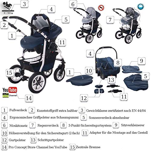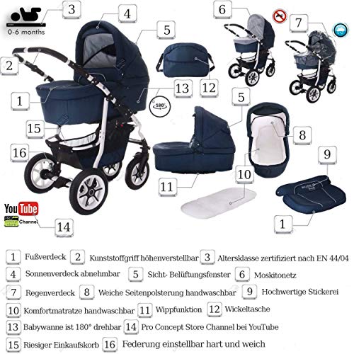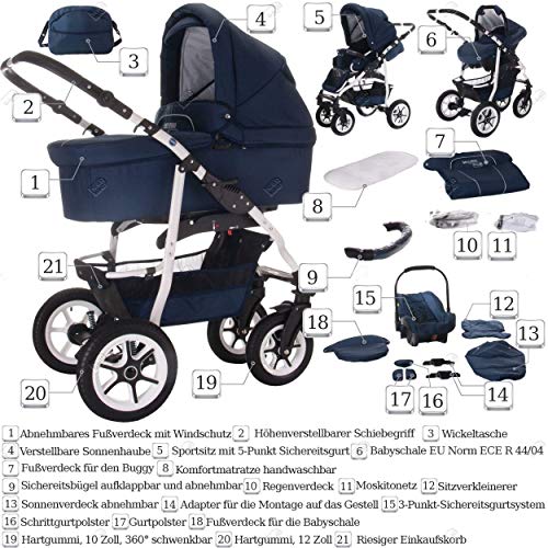 Unser BEBEBI BELLAMI 3in1 Kinderwagenset besteht aus: Babywanne, Sportwagen, Autositz, Gestell & Zubehör. Die Aufsätze können individuell in beide Richtungen (also in UND gegen die Fahrtrichtung) auf das Gestell gesetzt werden. Die Schwenkräder sorgen für eine besonders gute Manövrierfähigkeit in der Stadt. Die Stoßdämpfer und die Härteverstellung im hinteren Bereich machen den BELLAMI auch und besonders geeignet für Ausflüge auf unwegsamen Böden, im Gelände und sogar auf Splitt!Details KinderwagenaufsatzIn Fahr- & gegen Fahrtrichtung montierbar verstellbare und abnehmbare SonnenhaubeKomfortpolsterung des Innenraums aus kuschelweicher Baumwolleergonomischer, in die Sonnenhaube integrierter TragegriffFußabdeckung inklusiveDetails Autositz ECE R 44 / 04 (Prüfsiegel)zugelassen für den Straßenverkehr nach § 21 der StVOInkl. Fußabdeckung & verstellbarer Sonnenhaubegepolsterter 3-Punkt-Sicherheitsgurt; 2-fach in der Höhe verstellbarstufenlose Einstellung des Gurtumfangs möglichBezug handwaschbar, da komplett abnehmbarDetails BuggyIn Fahr- und gegen Fahrtrichtung montierbarverstellbare SonnenhaubeMehrstufig verstellbare RückenlehneSchlafposition möglichverstellbare Fußablage mit SchutzbezugGepolsterter 5-Punkt SicherheitsgurtAbnehmbarer Sicherheitsbügel (Rausfallschutz)Details Gestelläußerst stabiles Gestell aus einer Aluminium/Stahl-LegierungKomfort-Fahrwerk mit regelbarer FederungVorderräder: ca. 24 cm und um 360 Grad schwenkbar; inklusive FeststellfunktionHinterräder: ca. 30 cmLeichtgängige Sicherheitsbremsebesonders angenehmer Schiebegriff; mehrfach höhenverstellbargeräumiger und abnehmbarer Einkaufskorb unter den AufsätzenAllgemeinesTextilmaterialien sind speziell für Kinderwagen entwickelt worden
