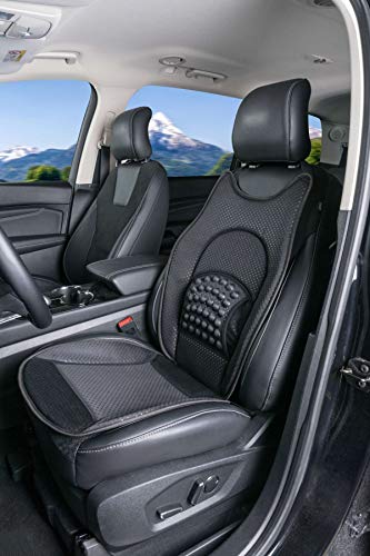 Sportlicher und weich gepolsteter Sitzaufleger New Space in schwarz – fuer entspanntes und ermuedungsfreies Fahren. Die Auto Sitz Auflage wertet mit ihrem sportlichen Design nicht nur optisch den Innenraum Ihres Fahrzeuges auf, sondern bietet mit der Schaumstoff Fuellung auch wesentlich mehr Fahrkomfort. Das hohe Rueckenteil sorgt mit 36 Massagenoppen fuer eine Entlastung der Wirbelsaeule und beugt Verspannungen im Nacken vor.Die Sitzauflage New Space ist einfach und schnell zu montieren. Sie hat 2 angenaehte Gummibaender, die jeweils am Sitz und an der Kopfstuetze befestigt werden.Der Sitzaufleger ist robust und strapazierfaehig und auch waschbar. Das Material ist atmungsaktiv sowie farb- und lichtecht.Die Sitzauflage passt auf alle gaengigen Fahrzeugmodelle mit und ohne Seitenairbag.Fuer Fahrzeuge ohne Seitenairbag gibt es keine Einschraenkungen.Bei Fahrzeugen mit Seitenairbag bitte den TUeV Bericht beachten. Details: – PKW Sitzauflage, Auto Sitzaufleger, Sitzschoner- Sitzauflage New Space schwarz- 36 Massagenoppen- entlastet die Wirbelsaeule- Material Sitzteil: 100% Polyester- Material Rueckseite: 100% Polypropylen- schnelle Montage- Schaumstoff Fuellung- Universalschnitt mit sehr hohem Rueckteil- bei 30 Grad waschbar- farbbestaendig- lichtecht- fuer alle gaengigen Fahrzeuge mit und ohne Seitenairbag