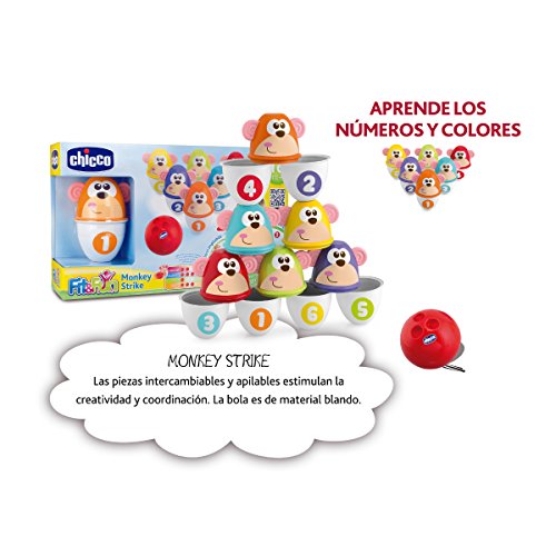 Jetzt kannst du dein eigenes Bowling Spiel haben, das Chicco Fit'n'Fun Affen Bowling Set. Probiere es einmal aus. Stelle die sechs Kegel auf und rolle sie mit dem Ball um. Kannst du alle auf einmal um rollen? Jede der Kegel kann außerdem in zwei Hälften geteilt und so zum Stapeln verwendet werden. So kannst du außerdem bunte Türme bauen. Für Fans ab 18 Monate. Inhalt: 6x Kegel, 1x weiche Kunststoff Bowling Kugel.
