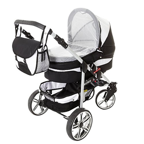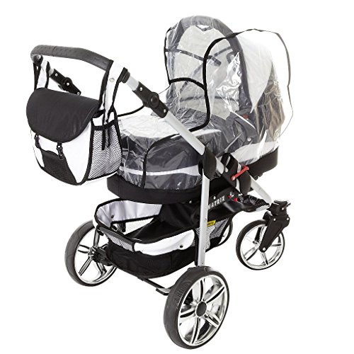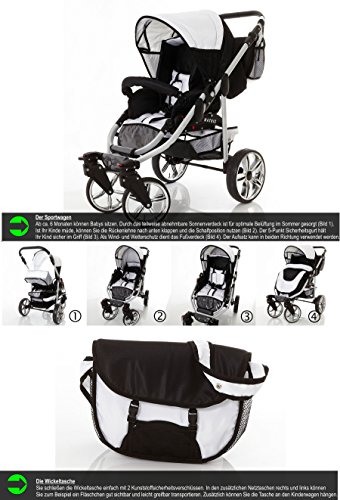 Kinderwagen (Babywagen Aufsatz) ca. 14 KG separate Babywanne mit waschbarem Einsatz kann auch ohne Kinderwagen getragen und genutzt werden kann beliebig umgesetzt werden Sichtfenster Faltbar (damit wird das Verstauen zum Kinderspiel) verstellbare Haube Wippfunktion ca. 77 x 37 x 20 cm (LxBxH) Sportwagen (Buggy Aufsatz) ca. 13 KG separater Sportsitz (ab 6. Monat)Mehrstufige Rücklehnenverstellung des Sportsitzes mit Liegefunktion Schlafposition möglich ca. 155° in die waagerechte Position Liegefläche ca. 91 cm der Sportsitz kann beliebig umgesetzt werden verstellbare Fußablage des SportsitzesSicherheitsbügelFußverdeck für den Sportwagen 5-Punkt Sicherheitsgurt verstellbare Haube, kürzbar Autositz ECE R 44/04 ca 2.8 KG geeignet für den Straßenverkehr nach § 21 der Stvo 3-Punkt Sicherheitsgurt Sitzverkleinerer, für die ersten Wochen Sitzerhöhung Sicherheitsgurt 2-fach in der Höhe verstellbar stufenlose Gurteinstellung Bezug abnehmbar und waschbar per Hand Wippfunktion Tragegriff 3-fach Verstellbar Sonnenhaube Gestell sehr leichtes Gestell separat zu verstauen höhenverstellbarer Schiebegriff sehr großer Einkaufskorb (hohe Belastbarkeit 3 kg) hochwertige sehr leichtgängige Sicherheitsbremse mittig bedienbar ca. 100 x 62 x 30 cm zusammengeklappt Räder extra große Schwenkräder für beste Fahreigenschaften auch auf holprigen Straßen (Vorderräder 9 Zoll (ca 23,6 cm) & Hinterräder 12 Zoll (ca. 30 cm) Schwenkräder feststellbar kugelgelagerte Reifen Zubehör Regenschutzbezug Moskitosnetz Wickeltascheweiteres Zubehör s. Fotos oben