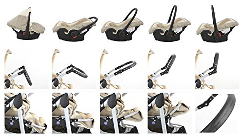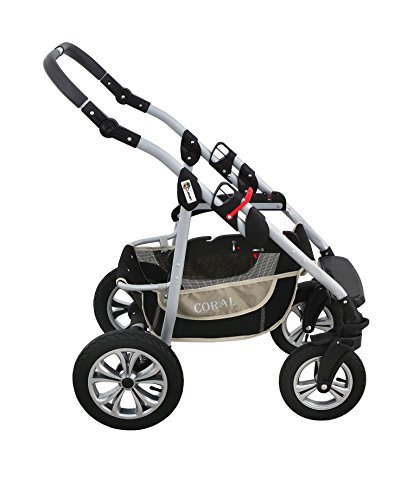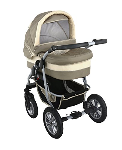 Das CORAL Kombi Kinderwagen System von CLAMARO ist ein leichtes und praktisches Kinderwagen System für anspruchsvolle und preisbewusste Eltern. Das Set besteht aus einem Kinderwagengestell, Babywanne, Sport Buggy und Baby Autoschale Inkl. Gratis Zubehör: Regenhaube 1 x für Babywanne und 1 x für Buggy, Mückennetz, Wickeltasche, Wickelunterlage, Flaschenhalter Details Gestell: Universal Gestell aus Alu/Stahl Konstruktion Komfort Fahrwerk mit einstellbarer Federung Luftbereifen (vorne 10 Zoll hinten 12 Zoll) Vorne 360° Schwenkräder mit Feststellfunktion Leichtgängige EASY-STOP Zentralbremse Schiebegriff mehrfach höhenverstellbar Geräumiger Einkaufskorb unter dem Gestell Zusammengeklappt Maße: ca. 102 x 57 x 31 cm (L/B/H) Gewicht: ca. 10 kg Details Wanne: Vorwärts und Rückwärts im Gestell einsetzbar Verstellbare Sonnenhaube mit Lüftungsfenster Weich gefüttert mit hypoallergen Baumwolle Innenmaß: ca. 79 x 37 x 19 cm (L/B/H) Inkl. Matratze und Fußabdeckung Gewicht: ca. 4 kg Details Buggy: Vorwärts und rückwärts im Gestell einsetzbar Verstellbare Sonnenhaube mit Lüftungsfenster 3-fach verstellbare Rückenlehne 5-fach verstellbare Fußablage mit Plastikbezug Gepolsterter 5-Punkt Sicherheitsgurt Abnehmbarer Sicherheitsbügel (Rausfallschutz) Inkl. gefüttertem Winterfußsack Gewicht: ca. 5,5 kg Details Autoschale: Gruppe 0+ (0-13 kg), ECE R44/04 konform (Europäische Sicherheitsnorm Prüfsiegel) Inkl. Fußabdeckung und verstellbarer Sonnenhaube Gepolsterter 3-Punkt Sicherheitsgurt ISOFIX geeignet (nur mit ISOFIX Basis die separat erworben werden) Gewicht: ca. 3,5kg Allgemeines: Textilmaterialien sind Öko-Tex 100 Standard zertifiziert Kinderwagen erfüllt die EU Sicherheitsnorm EN 1888:2004 Herstellergarantie: 24 Monate