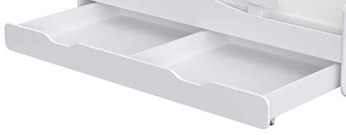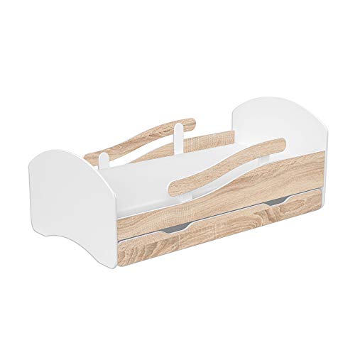 Clamaro Kinder- und Jugendbett Komplett Set 'LEO' mit 2 verstellbarem Rausfallschutz Seitenteilen, Lattenrost, Matratze und optional wählbarer Unterbett Rollschublade Mit dem 'LEO' Kinderbett von Clamaro sind süße Kinderträume garantiert. Die LEO Betten werden aus stabilen beschichteten Spanholzplatten hergestellt und sind an allen relevanten Ecken und Kanten mit einer speziellen umlaufenden Kantenschutzleiste aus Kunststoff überzogen. Die verstellbaren Rausfallschutz Seitenteile werden lose an die Bettseiten gesteckt und können bei Bedarf sogar verschoben werden. Der stabile Federholz Lattenrost und die weiche Matratze aus Schaumstoff mit seinem antiallergischen und waschbaren Überzug, runden das Set ab. Das Kinder- und Jugendbett kann mit oder ohne rollbaren Bettkasten bestellt werden. Produktdetails: Bett: Stabile, beschichtete Spanholzplatten mit umlaufendem Ecken- und Kantenschutz Leisten aus Kunststoff Verschiebbarer Rausfallschutz: 2x Seitenschutzleisten ca. 91 cm lang, für beide Bettseiten Matratze: Schaumstoffkern mit antiallergischem Schonbezug, Bezug abziehbar und waschbar Lattenrost: Hochwertiger Federholz Lattenrost, Konstruktion mit bis zu 130 kg belastbar Optional bestellbar mit oder ohne Bettkasten: Zweigeteilter Bettkasten auf Rollen und mit Eingriffen vorne Technische Details: Bett Außenmaße (L/B/H): 145 x 76 x 67 cm Maße der Matratze (L/B/H): 140 x 70 x 6-7 cm Rausfallschutz Länge: ca. 91 cm Lieferumfang: Lieferumfang: LEO Bett, 2x Rausfallschutz Seitenteile, Lattenrost, Matratze mit Schonbezug – OPTIONAL: Bettkasten