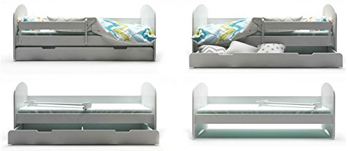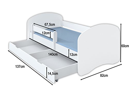 Jugend- und Kinderbett Komplett Set 'Schlummerland' von Clamaro – Kinderbett Set mit Klebemotiv (Motiv Austauschbar) Mit dem 'Schlummerland' Motiv Bett von Clamaro sind süße Kinderträume garantiert. Die Betten werden aus stabilen, beschichteten MDF Holzplatten hergestellt und sind an allen relevanten Ecken und Kanten mit einer ABS Kantenschutzleiste überzogen. Das verstellbare Rausfallschutz Seitenteil kann feste montiert oder lose an eine Bettseite gesteckt und verschoben werden. Der mitgelieferte Lattenrost und die Matratze aus Schaumstoff mit ihrem waschbaren Überzug, runden das Set ab. Das Bett für Jungen und Mädchen kann mit oder ohne Bettkasten bestellt werden. EINMALIG: Wenn das Motiv nicht mehr gefällt, können die Klebemotive nachbestellt und jederzeit ganz einfach ausgewechselt werden. Beschichtete MDF Holzplatten mit ABS Eck- und Kantenschutzleisten Beidseitig aufbaubar, Rausfallschutz kann feste montiert oder verstellt werden (gesteckt) Matratze aus Schaumstoff mit antiallergischem Schonbezug (waschbar) Lattenrost aus dicken Schichtholz Querstreben, bis zu 80 kg belastbar OPTIONAL: Bettkasten auf Rollen Lieferumfang: Bett, Motiv Aufkleber, Rausfallschutz Seitenteil, Matratze, Lattenrost, Unterbett Schublade (optional) 140x70er Bett: Bett Außenmaße (L/B/H): 144 cm x 82 cm x 60 cm Abmessungen Matratze (L/B/H): 140 x 70 x 7 cm 160x80er Bett: Bett Außenmaße (L/B/H): 164 cm x 92 cm x 65 cm Abmessungen Matratze (L/B/H): 160 x 80 x 7 cm Wechselmotive: Die Motive der Clamaro Schlummerland Betten müssen von Ihnen selber aufgeklebt werden. Die Aufkleber lassen sich kinderleicht anbringen und auch sehr leicht wieder ablösen. Bei Bedarf können Sie die Motive zum Austauschen nachbestellen. Tippen Sie in die Amazon Suche: Clamaro Kinderbett Aufkleber um die Motive zu finden.