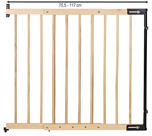 Das „KidsGuard V2“ Universal Holz Treppenschutzgitter ohne Türschwellen von Clamaro – Verstellbereich von 75,5 cm – 117 cm Beim Thema Treppensteigen und Kleinkinder läuten bei vielen Eltern die Alarmglocken. Es ist wohl der menschliche Entdecker Drang, der nahezu jedes Kind förmlich dazu zwingt jede noch so steile Treppe aufzusuchen und zu meistern. Damit das Abenteuer Treppe in einem unachtsamen Moment nicht gleich in einer Katastrophe endet, hat CLAMARO das „KidsGuard V2“ Treppengitter im Programm. Das Schutz Gitter wird ganz einfach an die Wand geschraubt und öffnet sich wie eine ganz normale Tür. Zum Öffnen und Schließen drückt man lediglich den Sicherungsknopf und hebt das Gitter leicht an. Effektiver und einfacher Kindersicherungsmechanismus Leichtes öffnen und schließen (Knopf drücken und Gitter anheben) Keine Türschwelle – Stolperfrei und freischwingend Großer Verstellbereich von 75,5 cm – 117 cm Breite Öffnungsrichtung wählbar (muss bei der Montage festgelegt werden) Auch für die Montage als Türschutzgitter geeignet (Borlöcher in Türrahmen nötig) Inkl. Montagematerial und Montageanleitung Maße: Höhe: 78 cm, Breite verstellbar von 75,5 cm – 117 cm ACHTUNG: Das Clamaro Treppenschutzgitter versperrt Kindern den freien Zugang zur Treppe oder Treppenhaus. Bitte lassen Sie Ihre Kinder dennoch niemals unbeaufsichtigt in Treppennähe spielen.