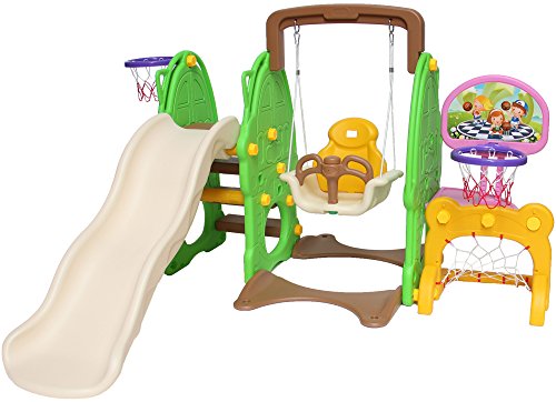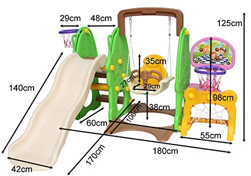 Clamaro Kinderrutsche „Kids ADVENTURE 5in1“ mit 140 cm langer Wellenrutsche, Kinder Schaukel, Fußballtor und 2 Basketballkörben, für draußen im Garten oder drinnen im Kinderzimmer Für die ganz mutigen… Wem unsere Baby ADVENTURE Rutsche für Kleinkinder nicht mehr genug Nervenkitzel verschafft, für diejenigen hat Clamaro die Kids ADVENTURE 5in1 Wellenrutsche im Programm. Sagenhafte Rutsch Geschwindigkeiten von bis zu 3,6 km/h (High Speed Schrittgeschwindigkeit) zaubern selbst den erfahrensten Wellenrutsch Reitern ein verschmitztes Lächeln aufs Gesicht. Clamaro hat die Kids ADVENTURE Rutsche so gebaut, dass es keine scharfen Kanten oder spitze Ecken gibt. Für noch mehr Sicherheit sorgen die stabilen Standbeine die mit Ihrer Breite ein Umkippen verhindern. Die großflächigen Stufen machen das erklimmen der Rutsche zum Kinderspiel. Ist die wellenförmige Kinderrutsche endlich erklommen, sorgt der in der Rutschfläche integrierte Handlauf für Sicherheit auf der rasanten Talfahrt. Zur Entspannung zwischendrin, kann wer mag auf der angebauten Schaukel entspannen, aufs Fußball Tor kicken oder einfach ein paar Körbe werfen. Die 2 integrierten Basketballkörbeb und das Fußballtor laden zur geselligen Slam Dunk, Streetball oder Kicker Partie ein Großflächige Stufen für leichtes hochklettern Integrierte Schaukel, Fußballtor und 2 Basketballkörbe Wellenförmige Rutschfläche mit ca. 140 cm Länge Stabile Konstruktion für Belastung bis 30 kg Abgerundete Kanten und Ecken Minutenschneller Aufbau ohne Werkzeug Wetterfest, Indoor und Outdoor tauglich Egal ob drinnen im Kinderzimmer oder draußen im heimischen Garten, mit den Clamaro Kinderrutschen und Spielplätzen der ADVENTURE Serie werden Ihre Kinder garantiert viel Freude und Spaß haben. Altersempfehlung: Für Kleinkinder ab 1 Jahr