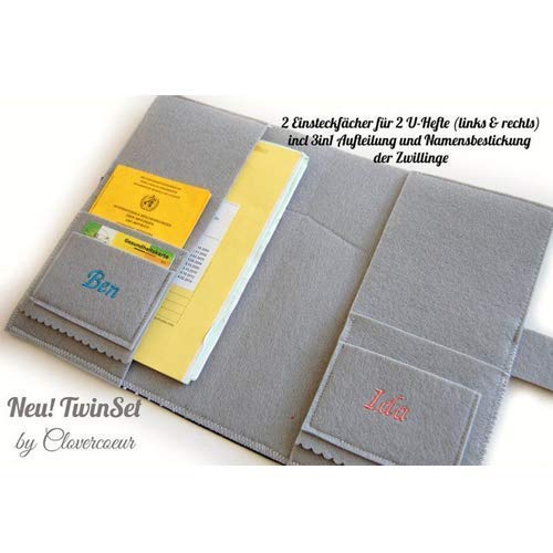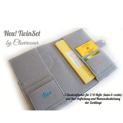 NEU BEI CLOVERCOEUR – DIE HÜLLE FÜR 2! Süße U-Hefttasche für 2 U-Hefte! Innen mit 3 in 1 Aufteilung auf beiden Seiten! Rechts & Links: 1 Fach für den Impfpass deines Babys 1 Fach für die Versichertenkarte jeweils ein großes Einsteckfach für die U-Hefte der Zwillinge Damit rechts und links keine Verwechslung entsteht, sind die Vorderseiten der Einsteckfächer mit dem Babynamen bestickt! *Bitte daher bei Kauf die Namen angeben Genäht ist die Hülle aus grauen Filz, belegt mit schwarzen Punktestoff, verziert mit Zackenlitze und Aufnäher oben (Motiv: Junge und Mädchen – *auch hier bei Kauf angeben ob 2 Buben, 2 Mädchen oder 1 Bube + 1 Mädchen – Das Bild wird daher dementsprechend angepasst*). Die Hülle wird mit einem Druckknopf verschlossen. Das Namensfeld (unten) kann mit Wunschtext wie Namen & Datum beschriftet werden. ——————————– Maße: geschlossen 18×25 cm aufgeklappt 25×36 cm ——————————– Gerne nähe ich die Hülle auch in anderen Farbkombinationen! Farbe des Filzes, Stoffes und des Aufnähers sind individuell änderbar! *TIPP: Gerne auch mit anderem Motiv. Alle Designs und Motive im Shop können dafür gewählt werden, oder einfach ein Motiv nach deinem Wunsch. *Das Modell kann auch für den österreichischen Mukipass angefertigt werden!*