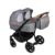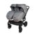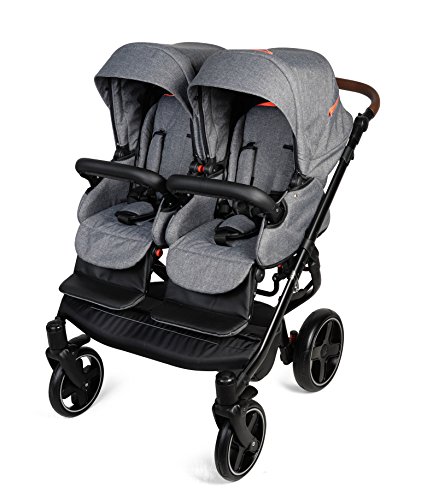 stabile Aluminiumrahmenkonstruktion mit Klappfunktion 1-Klicksystem zur einfachen Montage und Demontage praktischer Tragegriff zum leichten Verstauen des zusammengeklappten Gestells kugelgelagerte, leichte Gelreifen (ohne Schlauch) abnehmbare Räder (30,5 cm hinten, 24,5 cm vorne) zweistufige, doppelte Stoßdämpfung schwenk- und feststellbare Vorderräder per Fuß betriebene Feststellbremse höhenverstellbarer Schiebegriff (84 -112 cm) zusammengeklappt mit Rädern: 85 x 79 x 27 cm zusammengeklappt ohne Räder: 70 x 78 x 27 cm Radstand Außenmaß: 78 cm variable Höhe des Schiebers: 84 -112 cm Gewicht des Gestells inkl. Räder und Babywannen: 20,8 kg Gewicht des Gestells inkl. Räder und Sportsitze: 25,8 kg zwei weich gepolsterte Babywannen aus hochwertigem Kunststoff rückenschonende Neugeborenen-Matratze in der Wanne mit kuschliger Einlage Fußsack Innenmaß der Babywanne für Neugeborene: 78 x 30 x 18 cm zwei gepolsterte Sportsitze gepolsterter 5-Punkt-Sicherheitsgurt verstellbare Rückenlehne (bis in die Liegeposition) verstellbare Fußstütze abnehmbarer, gepolsterter Sicherheitsbügel Fußsack Innenmaß des Sportwagens: 29 x 80 x 38 cm (Breite des Sitzes x Länge des Sitzes x Höhe des Sitzes) zwei Autositze/Babyschalen mit abnehmbarer Haube und abnehmbarem Fußsack Neugeborenen-Einsatz für jede Babyschale 3-Punkt-Sicherheitsgurt beweglicher Griff zum einfachen Transport zugelassen nach DIN-Norm ECE 44-04 zugelassen bis zu 10 kg (6 Monaten) Kinderwagen mithilfe eines optionalen Adapters auch kompatibel mit Kindersitzen (0 – 13 kg) der Marken Maxi Cosi, Cybex, KiDDy und BeSafe Regenschutz Moskitonetz große Wickeltasche, am Griff zu befestigen geräumiger, schließbarer Einkaufskorb zwei extra Köfferchen