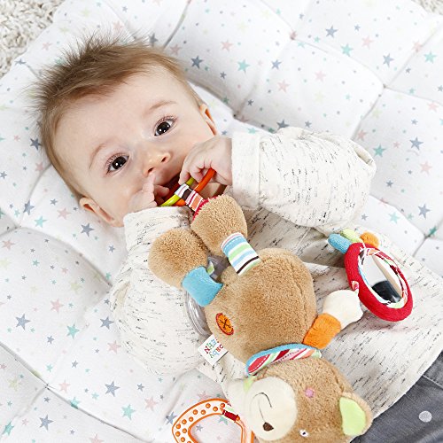 Farbenfroh und kuschelweich wird das Activity-Spieltier aus der Kollektion Oskar im Nu das Herz Ihres Babys erobern. Abwechslungsreiche Farben und Texturen und die verschiedenen Anhänger laden Ihr Baby zum Greifen, Kuscheln, Nuckeln und Fühlen ein. Das Dingdong im Bauch und die Ringrassel mit bunten Perlen in Regenbogenfarben wecken mit Geräuschen die Neugier Ihres Babys. Kleine Entdecker werden schnell verstehen was zu tun ist, um den freundlichen Oskar klingeln und rasseln zu lassen. In dem Spiegel kann Ihr Baby spielerisch sich selbst entdecken. Der orange Softbeißer mit Noppenstruktur hilft zusätzlich beim Zahnen. Dank der praktischen Klemme kann der freundliche Oskar einfach und sicher an Babyschale, Kinderwagen, Bettchen und Laufgitter befestigt werden und ist so der ideale Begleiter Ihres Babys zuhause und unterwegs.