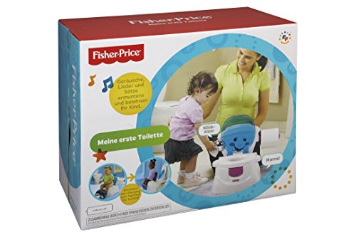 FISHER PRICE babygear Erste Toilette. Jetzt klappt der Übergang von Töpfchen zur Toilette spielend leicht. Realistische Elemente sprechen jedes Kind an. Die Lerntoilette reagiert beim Hoch- und Herunterklappen des Toilettendeckels, beim Ziehen der Spülung oder beim Abrollen des 'Toilettenpapiers' mit Sätzen, Musik und Soundeffekten. Mit drei Lernstufen: Anfangs als frei stehende Toilette, dannohne die Fußteile als Toilettensitz und schließlich nur mit Sitz und Deckel auf der Erwachsenentoiletten benutzbar. Die Schale wird zum Reinigen einfach aus dem Sitz herausgenommen. 3 Alkali-Batterien AA (399.007.0) sind erforderlich. Für Kleinkinder ab 9 Monate.