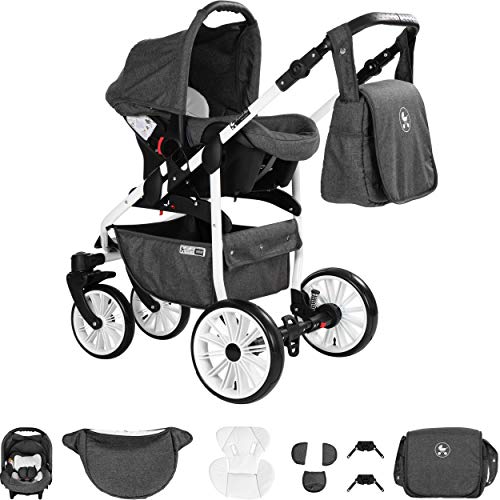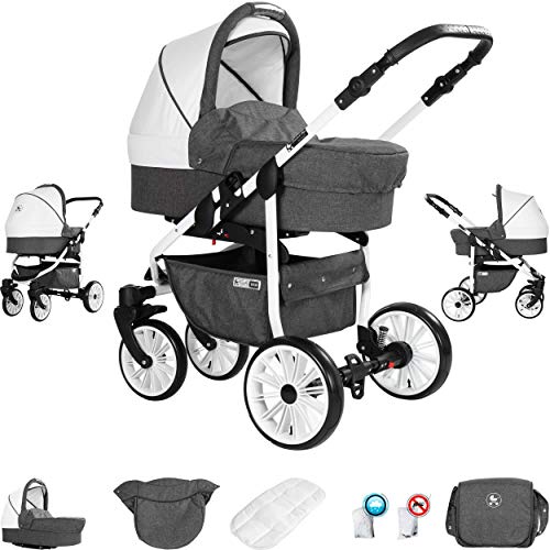 Unser FRIEDRICH HUGO BERLIN 3 in 1 Kinderwagenset besteht aus: Babywanne, Sportwagen, Autositz, Gestell & Zubehör. Die Aufsätze können individuell in beide Richtungen (also in UND gegen die Fahrtrichtung) auf das Gestell gesetzt werden. Die Schwenkräder sorgen für eine besonders gute Manövrierfähigkeit in der Stadt. Die Stoßdämpfer und die Härteverstellung im hinteren Bereich machen den BERLIN besonders geeignet für Ausflüge auf unwegsamen Böden, im Gelände und sogar auf Splitt!Details KinderwagenaufsatzIn Fahr- & gegen Fahrtrichtung montierbar verstellbare und abnehmbare SonnenhaubeKomfortpolsterung des Innenraums aus kuschelweicher Baumwolleergonomischer, in die Sonnenhaube integrierter TragegriffFußabdeckung inklusiveDetails Autositz ECE R 44 / 04 (Prüfsiegel)zugelassen für den Straßenverkehr nach § 21 der StVOInkl. Fußabdeckung & verstellbarer Sonnenhaubegepolsterter 3-Punkt-Sicherheitsgurt; 2-fach in der Höhe verstellbarstufenlose Einstellung des Gurtumfangs möglichBezug handwaschbar, da komplett abnehmbarDetails BuggyIn Fahr- und gegen Fahrtrichtung montierbarverstellbare Sonnenhaube mit verschließbarem AußenfachMehrstufig verstellbare RückenlehneSchlafposition möglichverstellbare Fußablage mit SchutzbezugGepolsterter 5-Punkt SicherheitsgurtAbnehmbarer Sicherheitsbügel (Rausfallschutz) Details Gestelläußerst stabiles Gestell aus einer Aluminium/Stahl-LegierungKomfort-Fahrwerk mit regelbarer FederungVorderräder: ca. 24 cm und um 360 Grad schwenkbar; inklusive Feststellfunktion Hinterräder: ca. 30 cmLeichtgängige Sicherheitsbremsebesonders angenehmer Soft-Touch-Schiebegriff; mehrfach höhenverstellbar (s.Oben)geräumiger und abnehmbarer Einkaufskorb unter den Aufsätzen