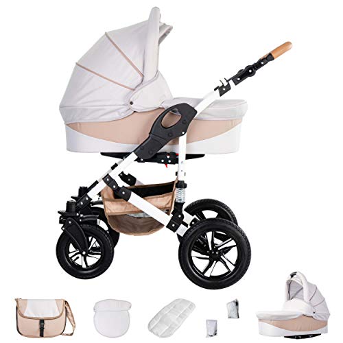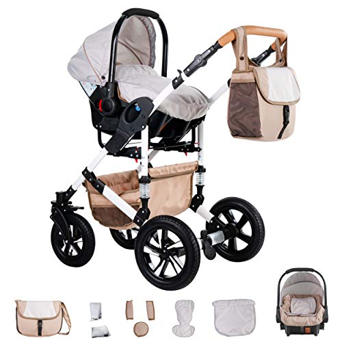 Unser FRIEDRICH HUGO HAMBURG 3 in 1 Kinderwagenset besteht aus: Babywanne, Sportwagen,Autositz Gestell & Zubehör. Die Aufsätze können individuell in beide Richtungen (also in UND gegen die Fahrtrichtung) auf das Gestell gesetzt werden. Die Schwenkräder sorgen für eine besonders gute Manövrierfähigkeit in der Stadt. Die Stoßdämpfer und die Härteverstellung im hinteren Bereich machen den HAMBURG auch und besonders geeignet für Ausflüge auf unwegsamen Böden, im Gelände und sogar auf Splitt!Details KinderwagenaufsatzIn Fahr- & gegen Fahrtrichtung montierbar verstellbare und abnehmbare SonnenhaubeKomfortpolsterung des Innenraums aus kuschelweicher Baumwolleergonomischer, in die Sonnenhaube integrierter TragegriffFußabdeckung inklusiveDetails Autositz ECE R 44 / 04 (Prüfsiegel)zugelassen für den Straßenverkehr nach § 21 der StVOInkl. Fußabdeckung & verstellbarer Sonnenhaubegepolsterter 3-Punkt-Sicherheitsgurt; 2-fach in der Höhe verstellbarstufenlose Einstellung des Gurtumfangs möglichBezug handwaschbar, da komplett abnehmbarDetails BuggyIn Fahr- und gegen Fahrtrichtung montierbarverstellbare Sonnenhaube mit verschließbarem AußenfachMehrstufig verstellbare RückenlehneSchlafposition möglichverstellbare Fußablage mit SchutzbezugGepolsterter 5-Punkt SicherheitsgurtAbnehmbarer Sicherheitsbügel (Rausfallschutz) Details Gestelläußerst stabiles Gestell aus einer Aluminium/Stahl-LegierungKomfort-Fahrwerk mit regelbarer FederungVorderräder: ca. 24 cm und um 360 Grad schwenkbar; inklusive Feststellfunktion Hinterräder: ca. 30 cmLeichtgängige Sicherheitsbremsebesonders angenehmer Soft-Touch-Schiebegriff; mehrfach höhenverstellbar (s.Oben)geräumiger und abnehmbarer Einkaufskorb unter den Aufsätzen AllgemeinesTextilmaterialien sind speziell für Kinderwagen entwickelt worden