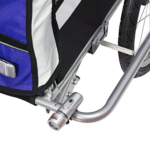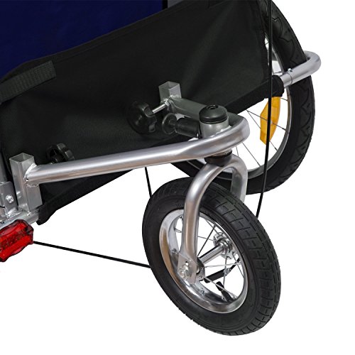 Die Kinder sitzen bequem und sicher in der geräumigen Kabine und sind vor Wind und Regen geschützt. Der Anhänger lässt sich mit wenigen Handgriffen in einen Kinderwagen umwandeln. Dank des voll flexiblen Vorderrads ist der Kinderjogger ein wendiger Begleiter. Mit diesem Fahrradanhänger und Kinderjogger werden Sie und Ihre Familie viel Spaß bei Ihren Ausflügen haben. Beschreibung:· 2 in 1: Kinderfahrradanhänger und Jogger · Fahrradanhänger lässt sich mit wenigen Handgriffen in einen Jogger verwandeln · 5-Punkt Sicherheitsgurte, gepolsterter Sitz und Gurtpolster sorgen für angenehmen · Deichsel lässt sich einfach unter den Anhänger schwenken · Vollgefederte Hinterachse, die Stöße sehr gut absorbiert – schont den Rücken der Kinder · Dach mit Netz und Regenschutz · Verstärkter Fußraum · Vorne mit einer Beleuchtung · Mit praktischem Staufach · Kompatible Kupplung mit extra Sicherung · Beidseitige Feststellbremse · Jeweils 2 Reflektoren vorne und hinten, 1 Reflektor pro Rad · Gut sichtbarer Sicherheitswimpel · StVO-zugelassen bei Nachrüstung eines zugelassenen Rücklichtes · Zusammenklappbar, leichter TransportTechnische Daten: · Material: Strapazierfähiger, regenabweisender Bezug aus Oxford; Gestell aus Eisen · Zulässiges Gesamtgewicht: 40 kg · Für Räder bis zu 26'' Zoll geeignet · 20″ Reifen, Luftbereifung · Gesamtsmaße: 106 x 90 x 105 cm (LxBxH) · Gewicht: 21 kg · Farben: lila-schwarzLieferumfang: · 1 x Kinderanhänger · Inkl. Kupplung