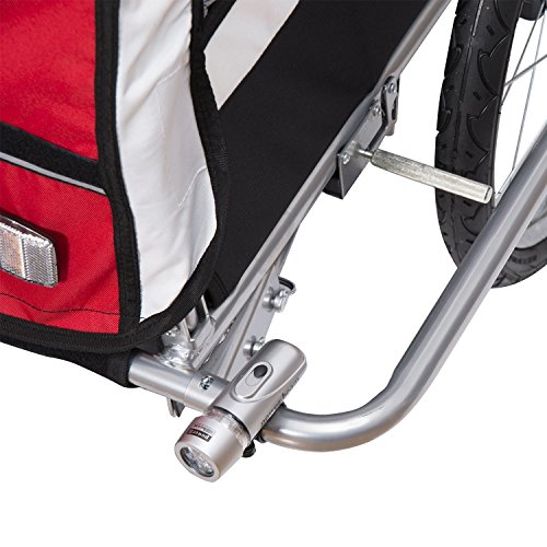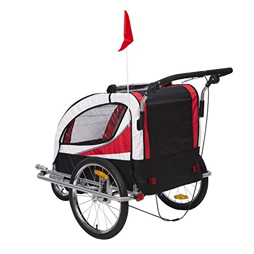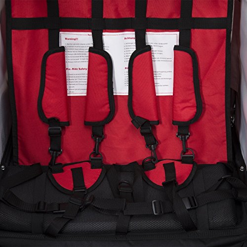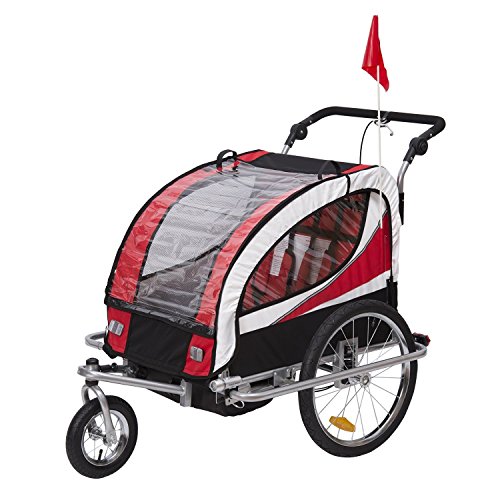 Die Kinder sitzen bequem und sicher in der geräumigen Kabine und sind vor Wind und Regen geschützt. Der Anhänger lässt sich mit wenigen Handgriffen in einen Kinderwagen umwandeln. Dank des voll flexiblen Vorderrads ist der Kinderjogger ein wendiger Begleiter. Mit diesem Fahrradanhänger und Kinderjogger werden Sie und Ihre Familie viel Spaß bei Ihren Ausflügen haben. Beschreibung:· 2 in 1: Kinderfahrradanhänger und Jogger · Fahrradanhänger lässt sich mit wenigen Handgriffen in einen Jogger verwandeln · 5-Punkt Sicherheitsgurte, gepolsterter Sitz und Gurtpolster sorgen für angenehmen · Deichsel lässt sich einfach unter den Anhänger schwenken · Vollgefederte Hinterachse, die Stöße sehr gut absorbiert – schont den Rücken der Kinder · Dach mit Netz und Regenschutz · Verstärkter Fußraum · Vorne mit einer Beleuchtung · Mit praktischem Staufach · Kompatible Kupplung mit extra Sicherung · Beidseitige Feststellbremse · Jeweils 2 Reflektoren vorne und hinten, 1 Reflektor pro Rad · Gut sichtbarer Sicherheitswimpel · StVO-zugelassen bei Nachrüstung eines zugelassenen Rücklichtes · Zusammenklappbar, leichter TransportTechnische Daten: · Material: Strapazierfähiger, regenabweisender Bezug aus Oxford; Gestell aus Eisen · Zulässiges Gesamtgewicht: 40 kg · Für Räder bis zu 26'' Zoll geeignet · 20″ Reifen, Luftbereifung · Gesamtsmaße: 106 x 90 x 105 cm (LxBxH) · Gewicht: 21 kg · Farben: Rot-SchwarzLieferumfang: · 1 x Kinderanhänger · Inkl. Kupplung
