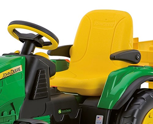Peg Perego John Deere Ground Force Elektrotraktor inkl. Anhänger Mit einem Gang mehr im Freien spielen Der hochwertige John Deere Elektrotraktor mit Anhänger sorgt nicht nur bei der Feldarbeit für großen Spielspaß für Kinder ab 3 Jahren. Detailgetreu nach dem großen Vorbild konstruiert, überzeugt er die kleinen Nachwuchs-Fahrer und sorgt dank Anhänger, der zum Lieferumfang gehört, für großen Spielspaß. Der Anhänger kann ganz einfach über einen Haken an- und wieder abgehängt werden. Die Umrandung des Anhängers hält die Ladung fest, über die offene Seite kann sie leicht auf- und abgeladen werden. Eine kleine Schwelle verhindert, dass die Ladung während der Fahrt vom Anhänger rutscht. Der John Deere Ground Force hat einen geschlossenen Unterboden, um die Insassen vor Stromkabeln zu schützen und Spritzwasser, Matsch und Sand vom Fahrzeug fern zu halten. Der Akku ist unter der Motorhaube untergebracht und wird durch einen kindersicheren Batteriehalter geschützt. Er kann mit dem mitgelieferten Ladegerät und einer normalen Haushaltssteckdose direkt vom Fahrzeug aus oder nach dem Entnehmen aufgeladen werden. Musikhören unterwegs Dank integriertem FM Radio kann unterwegs sogar stimmungsvolle Musik aufgedreht werden, das sorgt für noch mehr gute Laune beim Fahren und Spielen. Der Sitz mit zwei beweglichen Armlehnen lässt sich in zwei Positionen verstellen, so dass der Abstand zum Pedal und Lenkrad auf die jeweilige Größe des Kindes angepasst werden kann. Die robusten Profilreifen sorgen für ei