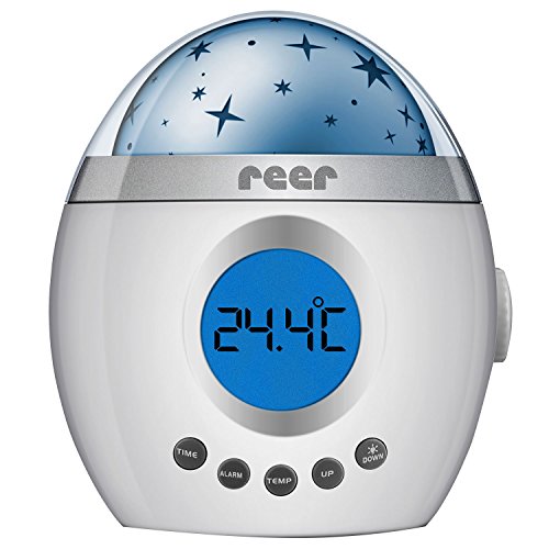 Ein ausgeglichener Schlaf ist für die körperliche und geistige Entwicklung von Kindern besonders wichtig, da neugewonnene Eindrücke vor allem nachts verarbeitet werden. Aber nicht nur ein ereignisreicher Tag, sondern auch die Angst vor der Dunkelheit kann kleine Abenteurer am Einschlafen hindern.Das MyMagicStarlight von reer ist so konzeptioniert, dass es optimal in Schlafrituale eingebunden werden kann. Es begleitet Kinder ab 36 Monaten sanft ins Reich der Träume und sorgt mit der Sternenprojektion für eine magische Umgebung.Die wohltuenden Klänge unterstützen gleichzeitig ein behagliches Einschlummern. Produktdetails: Moderne LED-Technologie Schildernde Beleuchtung: Sternenhimmelprojektor mit Farbwechsel. Blau, Lila oder Grün: Das MyMagicStarlight bringt Kinderaugen zum Strahlen. Die funkelnden Planeten direkt an der Kinderzimmerdecke sorgen für eine magische und ruhige Schlafumgebung. Licht- und Musikprojektion: Der integrierte AUX-Eingang ermöglicht Ihnen den Anschluss von Ihrem MP3-Player, Smartphone oder PC. Durch diese besondere Funktion können Lieblingslieder und Hörbücher individuell für die Kleinen abgespielt werden. Gespeicherte Sound-Auswahl: 5x Naturgeräusche, 10x Einschlaflieder 3-Stufen Timer (zuschaltbar: 15min – 30min -60min) LCD mit Uhrzeit-/Zimmertemperaturanzeige LC-Display mit Hintergrundbeleuchtung Farbe: weiß/grau Material: Kunststoff