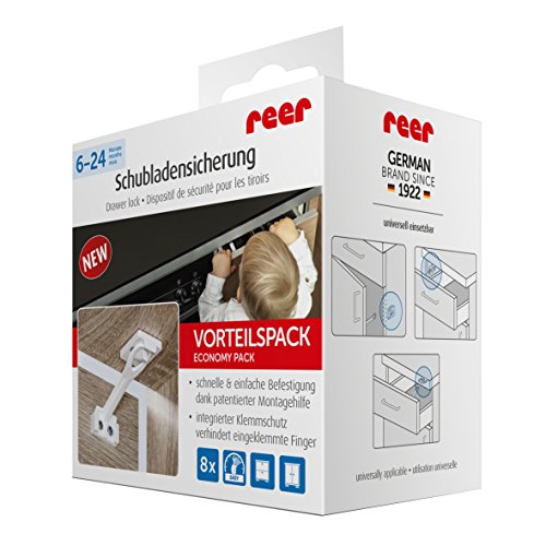 Verschließt zuverlässig Schränke & Schubladen vor neugierigen Kinderhänden Der Inhalt von Schränken und Schubladen ist für die Kleinen besonders spannend. Lernen sie krabbeln und laufen, erreichen sie leicht die Griffe und kommen an Gegenstände heran, die nicht in Kinderhände gehören, wie z.B. Messer oder giftige Reinigungsmittel. Um Ihren kleinen Liebling vor solchen Gefahren zu schützen, ist es besonders wichtig Schränke und Schubladen kindersicher zu verschließen. Die Schubladensicherung von reer hilft Ihnen zuverlässig dabei und ist mit der beiliegenden Montagehilfe besonders schnell angebracht. Patentierte Montagehilfe für eine schnelle und einfache Montage Durch die innovative Montagehilfe ist die Anbringung jetzt noch einfacher, schneller und insbesondere fehlerfrei möglich. Ein aufwendiges Abmessen und Anzeichnen zum Anbringen des Riegels ist nicht mehr erforderlich. Sie ermöglicht eine präzise Befestigung für noch mehr Sicherheit. Einfach Montagehilfe an den Schrank anlegen, Befestigungsteile aufstecken, am Schrank ankleben und anschrauben fertig. Die Montage wird zum Kinderspiel! Integrierter Fingerklemmschutz verhindert das Einklemmen beim Verschließen Beim Schließen der Schublade oder Schranktür wird der Sicherungsriegel durch den integrierten Fingerklemmschutz automatisch blockiert. Somit können schmerzhafte Quetschungen der zarten Fingerchen verhindert werden, falls die Kleinen einmal ihre Hände im Türspalt haben. Das Montagevideo zum Produkt Verschaffen Sie sich selbst einen Überblick, wie einfach und schnell der Artikel montiert werden kann. Universell einsetzbar für Schranktüren und Schubladen Die Sicherung kann sowohl in Schubladen als auch an der Innenseite einer Schranktür angebracht werden. Sie ist von außen nicht zu sehen und fügt sich somit „unsichtbar“ in