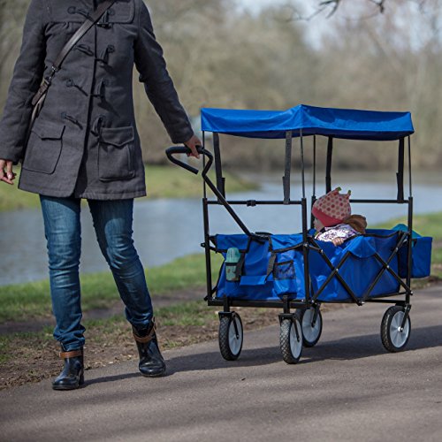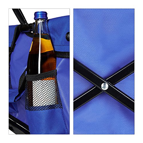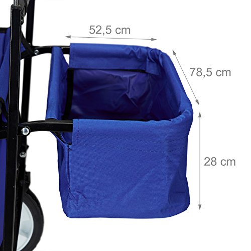 Mit diesem Bollerwagen mit Griff ist der nächste Ausflug mit den Freunden oder der Familie gerettet. Mit dem Griff ziehen Sie den Wagen einfach und bequem. Dank des stabilen Inneren des Fachs können Sie schwere Gegenstände wie Bierkisten, Einkäufe und vieles mehr transportieren. Eine eingelegte Matte gibt dem Transportwagen zusätzliche Stabilität und erhöht den Komfort.Dieses Modell verfügt dazu über 2 Fächer für Getränke und eine extra Tasche. Der Wagen lässt sich mit wenigen Handgriffen aufbauen und ist schnell für den ersten Ausflug startklar. Danach kann er über die praktische Faltfunktion platzsparend im Keller oder Auto verstaut werden. Details des Bollerwagen faltbar • Maße H x B x T: ca. 55 x 83 x 51,5 cm (Griff angelegt)• Zusammengeklappt H x B x T: ca. 74 x 52 x 22 cm • Metallgestell mit Stoffbezug aus Polyester • Gewicht gesamt: 11,9 kg • Großes Fach H x B x T: 28 x 52,5 x 78,5 cm (86 L Volumen) • Kleine Tasche H x B x T: ca. 17 x 48 x 23 cm (14 L)Weitere Details des Transportwagens• 2 kleine Fächer für Kleinigkeiten wie Getränke • Bodenfreiheit: ca. 24 cm • Einlegematte MDF mit Stoffbezug • 4 Gummi-Räder • Max. Ladegewicht: 80 kgTransportwagen in Blau klappbar• Ideal für Ausflüge mit Familien und Freunden • Praktisch als Transportwagen für Spielsachen, Kisten etc. • Als Einkaufswagen, Handwagen, Gartenwagen etc.• Lustiger Wagen für Vatertag oder gesellige RundenBollerwagen mit Gummirädern• Matte zum Einlegen für Stabilität • Kein lästiges Aufpumpen • Schneller und einfacher Aufbau (Maulschlüssel benötigt) • Bei Nicht-Verwendung einfach einklappenLieferumfang • 1x Bollerwagen mit Dach • 1x Aufbauanleitung • Dekoartikel sind im Lieferumfang nicht enthalten