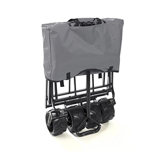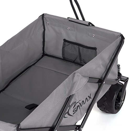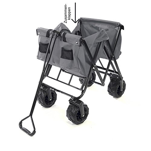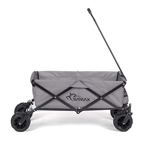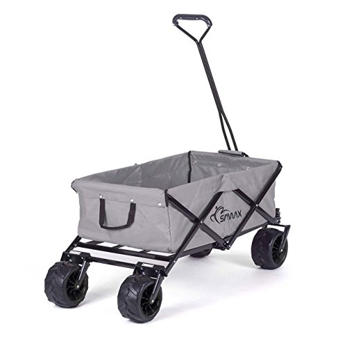 SAMAX Faltbarer Bollerwagen offroad – Grau Ob Werkzeug, Getränkekisten, Gepäck oder Einkäufe – unser praktischer Bollerwagen ist Ihnen stets ein treuer Begleiter, beim Familienausflug, als Unterstützung für Zeitungsverteiler, für Gartenarbeit oder andere Hobbys. Haben Sie sich erst einmal an unseren Bollerwagen gewöhnt, werden Sie ihn nicht wieder missen möchten. Jederzeit unkompliziert und schnell verstaut, nimmt unser Bollerwagen sehr wenig Platz in Anspruch und dank des komfortablen Griffs, werden Sie mühelos auch längere Strecken zurücklegen können.Um auf nahezu jedem Terrain vorwärts zu kommen, empfiehlt sich unser offroad Spezialist, der mit vier Kunststoffrädern zu Ihnen kommt. Das robuste Stahlgestell wird von einem Polyesterbezug umspannt. Dank der ausgeklügelten Konstruktion werden Sie stets über die Flexibilität kombiniert mit einer außergewöhnlichen Robustheit staunen. Der große Innenraum (ca. 80 x 45 cm) hält einer Belastung von bis zu 80 kg stand, und ermöglicht es Ihnen in Kombination mit unseren offroad-Rädern auch schwerere Lasten durch unwegsames Gelände zu transportieren.Technische Daten:Gesamtmaße ca. 110 x 50 x 48 cm (LxBxH) mit Griff ca. 121 cm hochLadevolumen: ca. 80 x 45 x 27 cm (LxBxH)Durchmesser der Räder: 17 cmMaße zusammengeklappt: ca. 17 x 50 x 77 cm (TxBxH)Faltbar – somit leichter zu verstauenMaterial: 100 % Polyester inkl. SchutzüberzugGewicht Bollerwagen ca. 10,5 kgMax. Ladegewicht: 80 kg