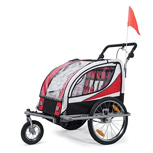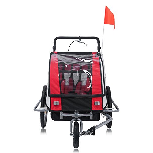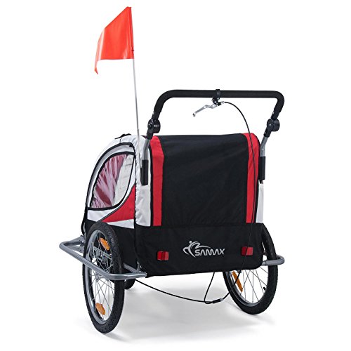 SAMAX 360° drehbarer Fahrradanhänger 2in1 Jogger – in Rot – Silver Frame Es kann sowohl in seiner hauptsächlich vorgesehenen Funktion als Fahrradanhänger mit einem 360° drehbaren Vorderrad für mehr Flexibilität, genutzt werden. Besonders hervorstechend ist die Funktion des 360° drehbaren Vorderrades. Schnelles Wenden des Anhängers stellt somit zukünftig auch bei wenig Platz keine Problematik mehr dar! Die Sitzbank bietet Platz für 1-2 Kinder, das zulässige Gesamtgewicht von 40 kg inkl. Kindern und Gepäckzuladung, sollten nicht überschritten werden. Während der Fahrt sorgen Hüft- und Schultergurte, sowie der Überrollbügel für Sicherheit. Wird der Kinderanhänger als Jogger genutzt, dient eine Handbremse zum Regulieren der Geschwindigkeit. Technische Daten:Gesamtmaße: ca. 133 x 88 x 108 cm (LxBxH)Maße Innenraum: ca. 55 x 50 x 68 cm (BxTxH)Maße Stauraum hinter der Sitzbank: ca. 55 x 25 x 68 cm (BxTxH)360° drehbares und feststellbares VorderradGefederte Hinterachse, absorbiert Stöße und schont den Rücken Ihrer KinderKinderleichter Auf- und Umbau ohne Werkzeug vom Jogger zum Fahrradanhänger für 1-2 Kinder10 Zoll Vorderreifen,20 Zoll Hinterreifen, LuftbereifungZulässiges Gesamtgewicht (Jogger + Zuladung): max. 40 kgEigengewicht Jogger: ca. 20 kg / Maximale Zuladung: ca. 20 kgDer Kinderfahrradanhänger ist nicht für Elektrofahrräder / Pedelecs geeignetEigenschaften:Sehr stabiler Stahlrohrrahmen mit ÜberrollbügelHüftgurt und Schultergurte mit PolsterGut sichtbarer Sicherheitswimpel und 8 Reflektoren, Reflektor-LogoStrapazierfähiges Rollverdeck als Regenschutz und FliegengitterAltersempfehlung: ab 18 MonatenDie Farben können je nach Bildschirmeinstellung leicht abweichen.
