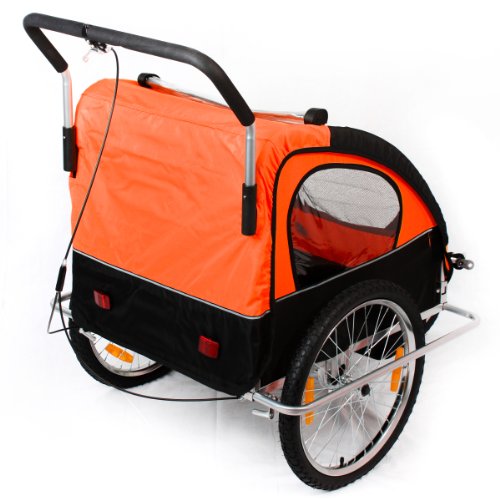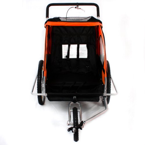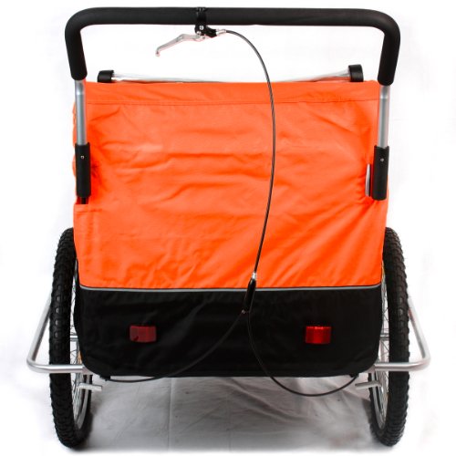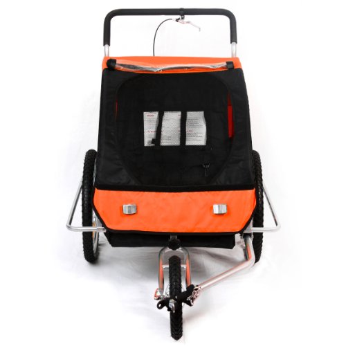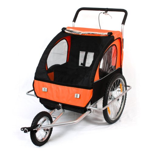 SAMAX Fahrradanhänger 2in1 Jogger – in Orange/Schwarz – Silver FrameDieses 2in1-Modell kann sowohl als Fahrradanhänger genutzt werden – aber auch als Jogger. Durch Demontage der Räder und der Stange im oberen Gehäuse, lässt sich das dreirädrige Gefährt auseinander nehmen und wieder zusammen bauen. Damit ist der Fahrradanhänger auch für den Transport im Auto geeignet und kann bei längerem Nichtgebrauch platzsparend verstaut werden.Die Sitzbank bietet Platz für 1-2 Kinder, das zulässige Gesamtgewicht von 40 kg sollte nicht überschritten werden. Während der Fahrt sorgen Hüft- und Schultergurte, sowie der Überrollbügel für Sicherheit.Den nötigen Komfort bietet der 2in1-Kinderfahrradanhänger durch seine gefederte Hinterachse und das Verdeck. Es besteht aus zwei einzeln aufrollbaren Lagen, eine mit Fliegengitter, die andere mit Klarglasfolie als Regenschutz.Technische Daten:Gesamtmaße: ca. 138 x 88 x 107 cm (LxBxH)Maße Innenraum: ca. 56 x 54 x 71 cm (BxTxH)Gefederte Hinterachse, absorbiert Stöße und schont den Rücken Ihrer KinderKinderleichter Auf- und Umbau ohne Werkzeug vom Jogger zum Fahrradanhänger für 1-2 Kinder20 Zoll Reifen, LuftbereifungZulässiges Gesamtgewicht (Jogger + Zuladung): max. 40 kgEigengewicht Jogger: ca. 20 kg / Maximale Zuladung: ca. 20 kgDer Kinderfahrradanhänger ist nicht für Elektrofahrräder / Pedelecs geeignetEigenschaften:Sehr stabiler Stahlrohrrahmen mit ÜberrollbügelHüftgurt und SchultergurteGut sichtbarer Sicherheitswimpel und 8 ReflektorenStrapazierfähiges Rollverdeck als Regenschutz und Fliegengitter2 seitliche InnenraumtaschenAltersempfehlung: ab 18 MonatenFarben können je nach Bildschirmeinstellung leicht abweichen.