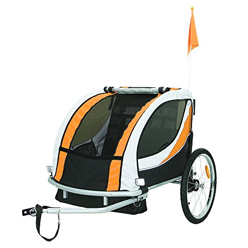 Kinderfahrradanhänger Fahrradanhänger Jogger 2in1 Anhänger Kinderanhänger Wenn Sie Kinder haben und gerne Fahrrad fahren, werden Sie zweifellos den Kauf eines Qualitäts-Kinderfahrradanhänger zu schätzen wissen. Es gibt ohne Zweifel keine bessere Möglichkeit für den Transport von Kindern und Gepäck, bei Reisen oder beim Sport mit dem Fahrrad. Artikelbeschreibung: Für 1 oder 2 Kinder geeignet 360° drehbares Joggerrad vorne Joggergriff stufenlos in der Höhe einstellbar Federung an der Hinterachse Starker Stahlrohrrahmen und wasserdichte Polyester Abdeckung (600D)Einfacher Umbau von Fahrradanhänger zu einem Jogger5-Punkt Sicherheitsgurt und gepolsterter Sitz für zusätzliche Sicherheit und KomfortFenster und Wetterschutz mit UV-SchutzInnentaschen für Kinder und grosser Stauraum hinter dem SitzOhne Werkzeug schnell zusammen gebautZusammenklappbar für den Transport und AufbewahrungUniversal-Kupplung für die Hinterachse inklusiveFahrradanhänger bleibt stehen, auch wenn das Fahrrad umkippt20“ LuftbereifungReflektoren sind an allen Seiten angebracht, für zusätzliche Sicherheit bei schlechtem Wetter und in der DunkelheitSicherheitswimpel für verbesserte SichtbarkeitJogger-Kit inklusive (12“ Vorderrad und Schiebegriff)StVZO zugelassen bei Nachrüstung eines zugelassenen Rücklichtes Technische Daten: Maximale Kapazität: 40 kgInnenlänge:80 cmSitzbreite: 60cmInnenhöhe: 60cmGewicht: 17,0 kgMasse zusammengeklappt: 80cm x 22cm x 68cm (LxHxB)Farbe: ORANGE / SCHWARZ