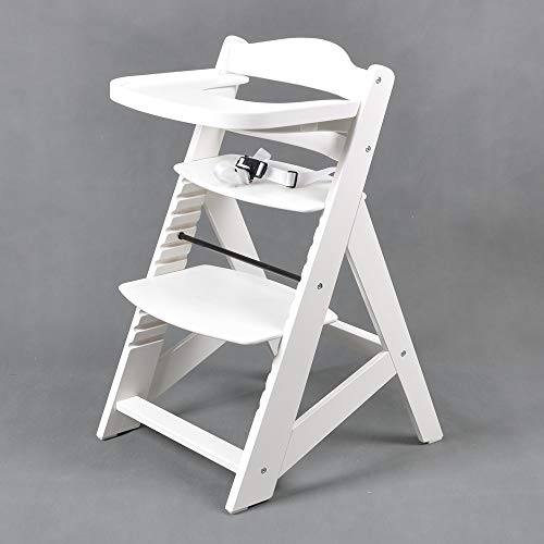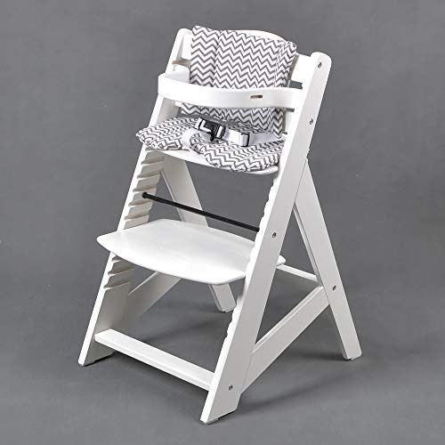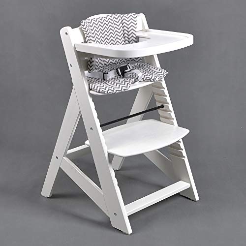 Ein moderner Holzhochstuhl, der mit Ihrem Kind mitwächst. Eine durchdachte Konstruktion ermöglicht eine Einstellung von einem jungen Baby bis zu einem Kleinkind. Das Kind sitzt am Tisch mit der ganzen Familie. Dieser Hochstuhl kann auch für grössere Kinder verwendet werden. Artikelbeschreibung: einfache Montage abnehmbares Essbrett / Tischplatte inklusive Schutzbügel, für die Sicherheit Ihres Kindes abnehmbare EXTRA GROSSE Tischplatte ideal für das Zusammensein der ganzen Familie am Esstisch ergonomisch geformte Polster, für die Sitzfläche und Rückenlehne inklusive konzipiert für eine lange Lebensdauer Sicherheitsgurt verstellbare Sitz- und Fussflächen hochwertige Materialien Stoffteile: 50% Polyacryl / 50% Baumwolle gepolsterte Kissen, abnehmbar und leicht zu reinigen Technische Daten: Altersgruppen: 6 Monate bis 10 Jahre (max. Gewicht 25 kg) Abmessungen: 48 cm x 58 cm x 80 cm (L x B x H) Gewicht: 7.50 kg Holzfarbe: WEISS Kissenfarbe: GRAU-WEISS