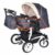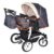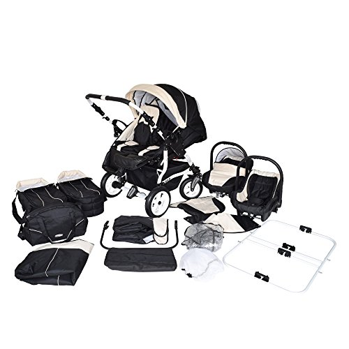 Ausstattung:• solide Stahlkonstruktion• 4x Federung• schwenkbare Vorderräder 360° – > feststellbar• 2 Softtragetaschen mit festem Boden und abnehmbarem Sonnenschutz• Regenschutzüberzug und Moskitonetz• Sportwagenfunktion ab dem 6. Lebensmonat nutzbar• große Wickeltasche mit Tragegurt• sehr geräumiger Einkaufskorb (leicht zugänglich)• Sicherheitsbügel abnehmbar• Wetterverdeck mit extra hohem Windschutz• 5 Punkt Sicherheitsgurt inkl. Gurtpolster• 3 stufige Rückenlehnenverstellung (getrennt einstellbar)• Sichtfenster und Klimatisierung am Verdeck• Aufsatz beidseitig verwendbarDetail:• Gestell zusammengeklappt mit Räder: 92,5 x 78,5 x 45 cm• Gesamthöhe Kinderwagens bis Verdeckspitze: 106 cm• höhenverstellbarer Schieber in der Höhe von: 77 – 113 cm• Liegehöhe vom Boden: 50 cm• Radstand Achsmaß: 49 cm• Innenmaß: 84 x 55 x 19 cm• Innenmaß der Softtragetasche: 75 x 26 x 19 cm• Aussenmaß: 55 x 26 x 12 cm• Gewicht Gestell: 12 kg• Gewicht Sportwagen: 20 kg• Gewicht Kinderwagen: 22,5 kg• Stoff: 100 % Polyester• Gestell: StahlrohrDie Babyschale• Babyschale zum einsetzen in den Kinderwagen• die Babyschale wird mit passendem Adapter am Kinderwagen verbunden• passend für Kinder mit einem Körpergewicht bis 10 kg• 3-Punkt-Sicherheitsgurt-System• 3 alternative Positionen für den Tragegriff• weiches Material im Bereich des Kopfes und der Hüften sorgt für Komfort und Wärme• entspricht dem europäischen Sicherheitsstandard ECE R44/04• Babyschale kann gegurtet oder mit Isofix Station genutzt werden Lieferumfang:1. Kinderwagen mit Verdeck2. Fußverdeck für Kinderwagen3. großer Einkaufskorb4. Softtragetasche5. Wickeltasche mit Tragegu