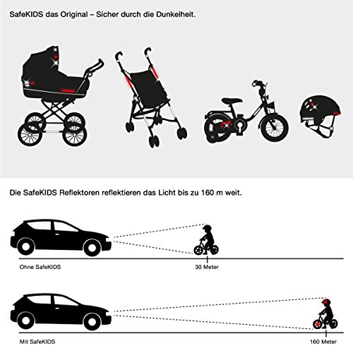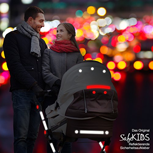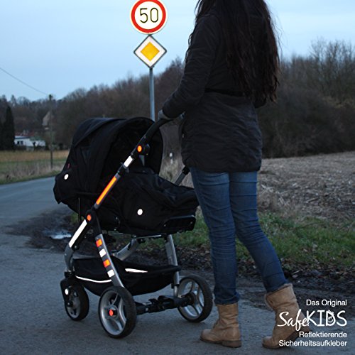 SafeKIDS von Wandkings- Sicher durch die Dunkelheit. – Made in Germany! Für Sicherheit im Straßenverkehr. Nicht nur Radfahrer sollten in der Dunkelheit gut sichtbar sein. Auch Fußgänger und vor allem Fußgänger mit Kinderwagen sollten aus großer Entfernung von heranfahrenden Autos frühzeitig erkannt werden. Rüsten Sie deshalb Ihren Kinderwagen mit unseren selbstklebenden SafeKIDS Reflektoren nach und machen Sie den Spaziergang im Dunklen viel sicherer – für sich und vor allem für Ihr Kind! Unsere SafeKIDS Reflektoren sind selbstklebend und haften sowohl am Rahmen den Kinderwagens, als auch an allen Stoffbezügen, was die Sicherheit noch einmal enorm steigert. In der Straßenverkehrsordnung ist unter § 67 „Lichttechnische Einrichtungen an Fahrrädern“ festgelegt, dass Fahrräder nur straßentauglich sind, wenn sie die gesetzlich geregelten, lichttechnischen Einrichtungen einhalten. Nehmen Sie Ihre Sicherheit selbst in die Hand und machen Sie auch Ihren Kinderwagen in der Dunkelheit gut sichtbar. Unsere SafeKIDS Reflektoren Aufkleber – Kleben nicht nur auf dem Rahmen des Kinderwagens, sondern auch auf den Stoffen. – Selbstklebend und in vielen Farben erhältlich.- Beständig gegen Öle, Fette und Putzmittel. – Unauffällig am Tag, in der Dunkelheit reflektieren sie das Licht in alle Richtungen – dadurch werden Sie viel schneller von Fahrzeugen wahr genommen. – Reflektieren ohne zusätzliches Hilfsmittel (ohne Batterie). Reflektion und Leuchtkraft – Die SafeKIDS Reflektoren reflektieren das Licht bis zu 160 m weit.- Heranfahrende Autos erkennen den Fußgänger mit Kinderwagen somit schon aus einer Entfernung von 160 m. – Ohne Reflektoren wird ein Fußgänger erst aus 30 m gesehen.