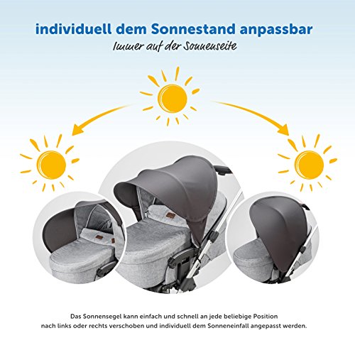 Zamboo Universal Sonnendach für Kinderwagen, Sportwagen und Buggy Zuverlässiger Pop-Up-Sonnenschutz mit praktischem Transport-Beutel Großflächig, stabil und leicht Das XL-Sonnenverdeck ist die perfekte Alternative zu Sonnenschirm und Sonnensegel. Es passt an jeden Kinderwagen und schützt Ihr Kind zuverlässig vor UV-Strahlen. Das Sonnendach vergrößert das Verdeck Ihres Buggys, Sportwagen oder Erstlingswagen und spendet Ihrem Kind angenehm Schatten. Das luftdurchlässige Material sorgt dabei für angenehmes Klima unter der Baby-Sonnenblende.Praktisch: Wird der Sonnenschutz nicht mehr benötigt, können Sie ihn einfach mit dem Kinderwagenverdeck zurückschieben. Einfach zu befestigen, praktisch zu verstellen Mit langen Bändern befestigen Sie das Sonnendach an Schieber oder Rahmen. Eine Möglichkeit findet sich wohl bei jedem Kinderwagen. So ist der Sonnenschutz universell einsetzbar und passen für alle Buggy- und Sportwagenmodelle. Dabei kann das Verdeck beliebig angebracht werden. Seitlich, wenn die Sonne von rechts oder links kommt. Oder bis ganz nach unten gezogen, wenn die Sonne tief steht oder Ihr Baby geschützt schlafen will. Mini-Format, leichter Aufbau dank Pop-Up und praktischer Transportbeutel Das Sonnenverdeck spannt sich von selbst auf – wie man es von Pop-Up-Zelten kennt. Die Anbringung ist dadurch super einfach. Mit einem Handgriff können Sie es wieder zusammenlegen und in der praktischen Transporttasche verstauen. Der kleine Beutel ist mit einer Klett-Schnalle ausgestattet und kann einfach an Schieber oder Rahmen gehängt werden. Oder Sie werfen ihn einfach in den Korb oder Ihre Wickeltasche. Maße Sonnenschutz offen: 60 x 80 cm Maße Transporttasche: 26 x 28 cm Material: 100% Polyester